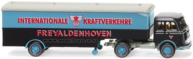 1/87 Mercedes-Benz Prime Mover Truck & Semi Box Trailer. Made by Wiking. Decorated in "Internationaler Kraftverkehr Freyaldenhoven" livery & features left-hand drive, detachable trailer, precision detail. This set is made of plastic & is 140mm long, 26mm wide & 39mm high.This item is not suitable for children.