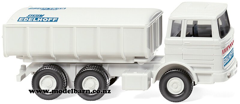 1/87 Mercedes-Benz NG 3-Axle Tip Truck. Made by Wiking. Decorated in "Edelhoff" livery & features left-hand drive, tipping body, tow hook, precision detail. Attaches to most 1/87 Wiking trailers. This truck is made of plastic & is 83mm long, 28mm wide & 42mm high (when fully extended).