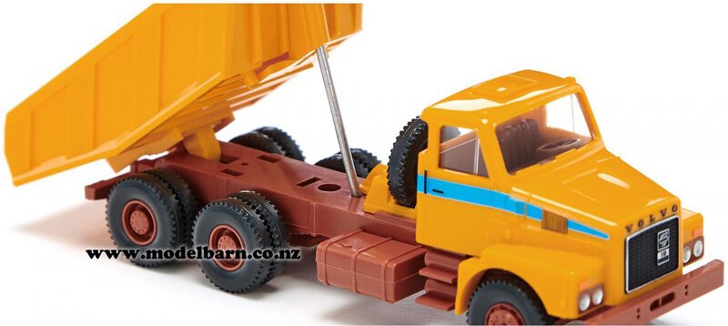 1/87 Volvo N10 3-Axle Tip Truck. Made by Wiking. Decorated in "Maize Yellow" livery & features left-hand drive, tipping body, precision detail. This truck is made of plastic & is 93mm long, 26mm wide & 60mm high (when fully extended).