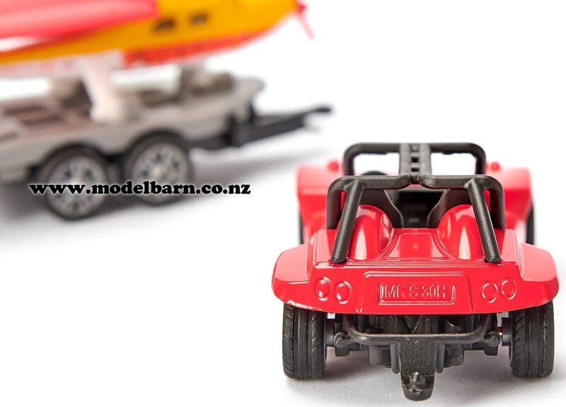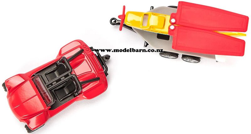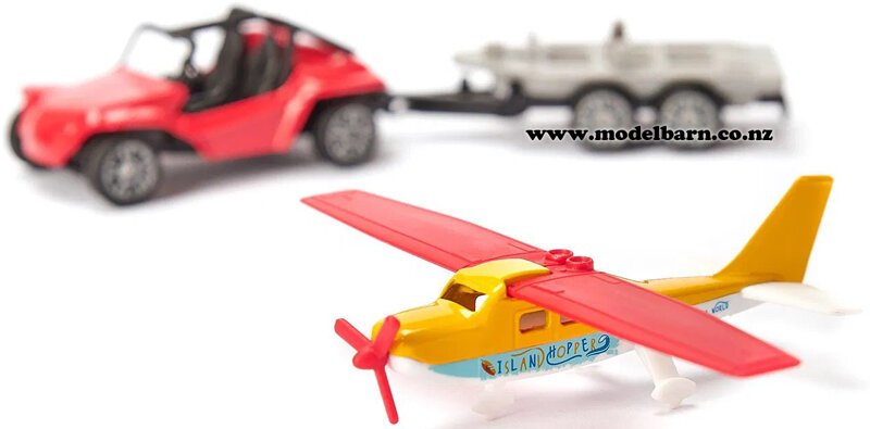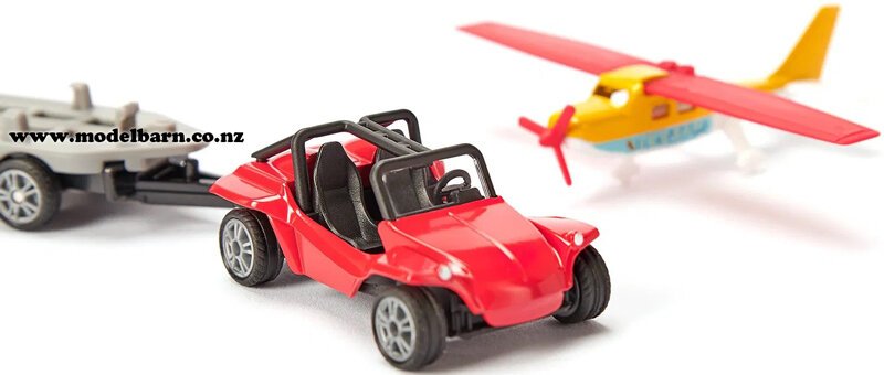 Beach Buggy with Trailer & Sports Airplane Set. Made by Siku. Beach buggy features left-hand drive, tow hook. The airplane can be unloaded from the trailer & the trailer can be detached from the beach buggy. The airplane features folding wings, rotating propeller. This set is 155mm long, 39mm wide & 39mm high.This set is not suitable for children under 5.