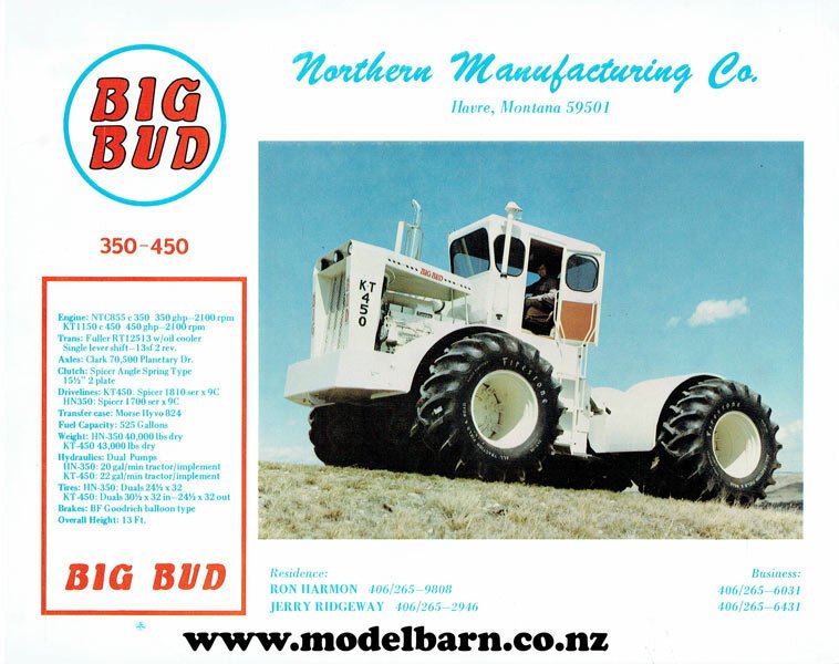 Big Bud Tractor Brochure. This is an original brochure printed in the United States. This brochure has a photo of a Big Bud KT-450 & specs of Big Bud tractors. Models shown; HN-250, KT-450. This is a used item in very good condition but does have some imperfections. Only 1 available. This cardboard brochure is 255mm wide & 205mm high & is only 1 page.