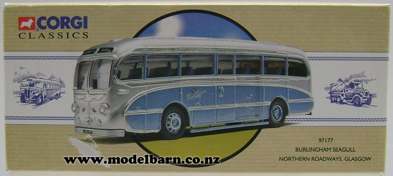 Burlingham Seagull Coach. Made by Corgi in 1993 as part of their "Classic Public Transport" series. Decorated in "Northern Roadways" livery & features right-hand drive, good detail. This is a used item in very good condition but its steering wheel is loose in the coach & it may have small imperfections. Its box is in good condition but has marks, creases & tears. Only 5000 have been made of this limited edition. Only 1 available. Comes with collector's certificate. the mirrors are included in the package. This bus is 185mm long, 49mm wide & 64mm high.This item is not suitable for children under 8.