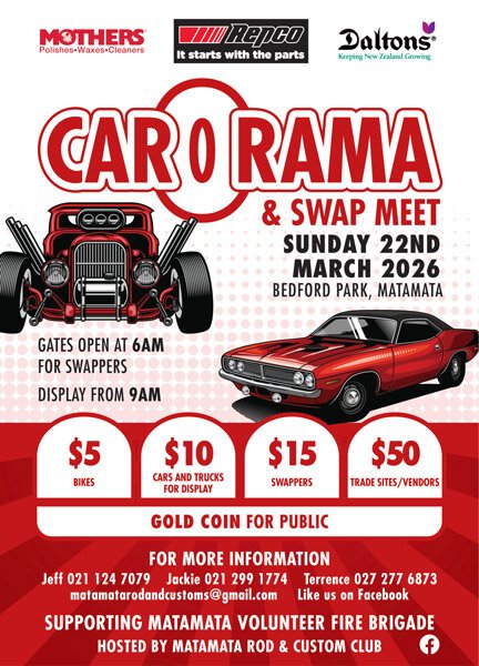 March 22 2026 Gates open at 6.00amBedford ParkMatamataFor further info;Jeff 021 124 7079Jackie 021 299 1774Terrence 027 277 6873matamatarodandcustoms@gmail.comHosted by the Matamta Rod & Custom Club with gate takings this year are being donated to the Matamata Volunteer Fire Brigade.Unfortunately Model Barn will not be at this event.