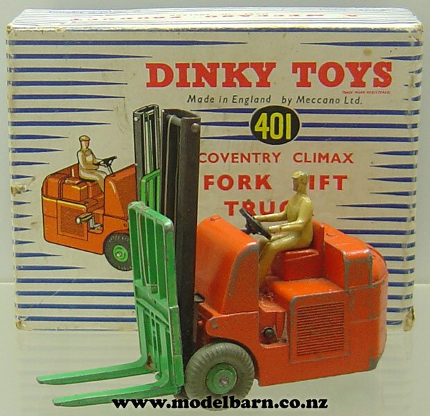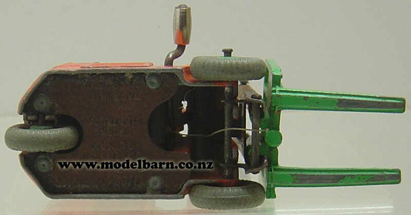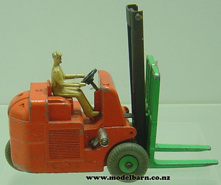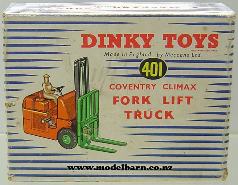 Coventry Climax Forklift. Made by Dinky of England from 1949 - 1953. Forks raise & lower using the handle. This is a used item in good condition for its age but it does have paint chips & rub marks & may have other imperfections. The box is in fair condition & has some marks, & creases. Only 1 available. This forklift is 107mm long, 55mm wide & 85mm high.