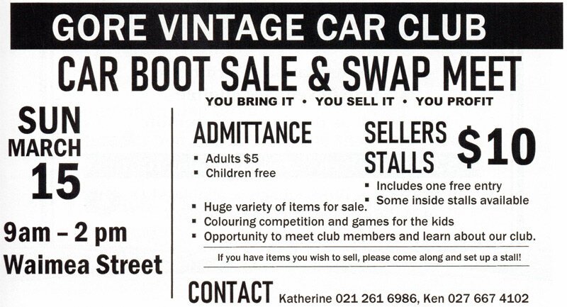 March 15 2026 8.00am - 12.00 NoonWaimea StreetGoreHosted by the Gore Vintage Car Club.For more information:Katherine 021 261 6986Ken 027 667 4102Unfortunately Model Barn will not be at this event.