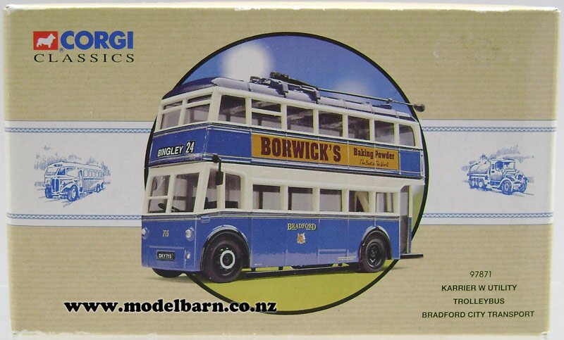 Karrier W Utility Trolleybus. Made by Corgi in 1994 as part of their "Classic Public Transport" series. Decorated in "Bradford City Transport" livery & features right-hand drive, good detail. This is a used item in very good condition but may have small imperfections. Its box is in good condition but has marks & creases. Only 6500 have been made of this limited edition. Only 1 available. Comes with collector's certificate. This trolleybus is 157mm long, 48mm wide & 95mm high.This item is not suitable for children under 8.