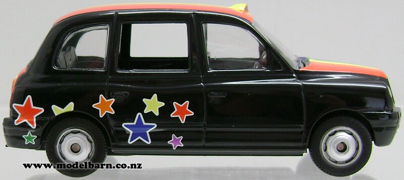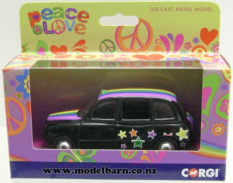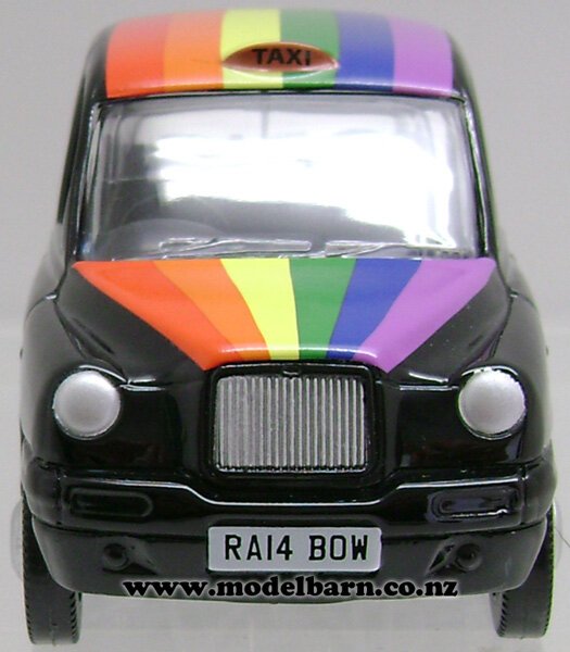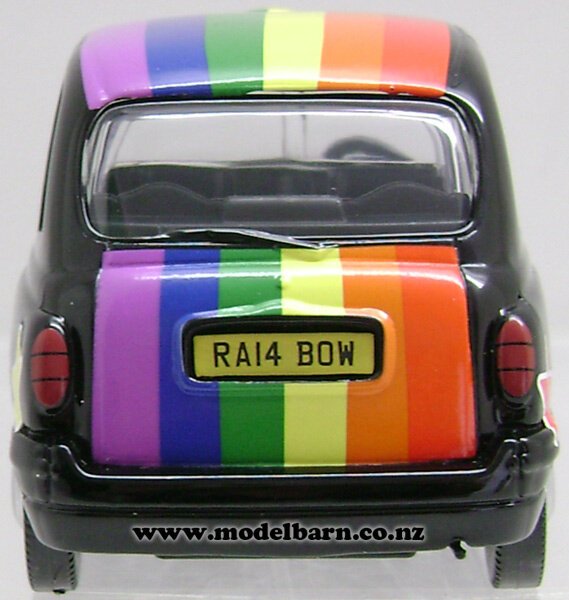 London Taxi Car. Made by Corgi. Decorated in "Rainbow" livery & features right-hand drive, nice detail. This is a used item in very good condition but may have small imperfections. Its box is in good condition but has marks & creases. Only 1 available. This vehicle is 125mm long, 47mm wide & 49mm high.This item is not suitable for children under 5.