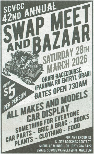 March 28 2026 Gates open at 7.30amOrari RacecoursePanama RoadOrariCanterburyHosted by the South Canterbury branch of the Vintage Car Club.For further information:Michelle Munro027 284 6422scvccswapmeet@hotmail.comUnfortunately Model Barn will not be at this event.