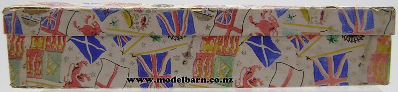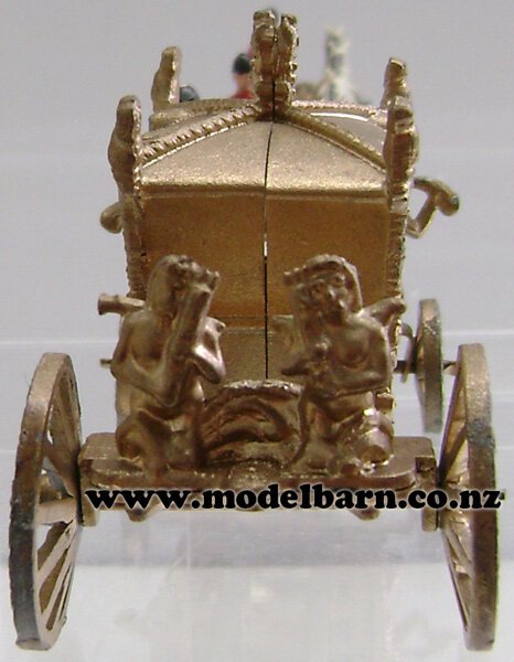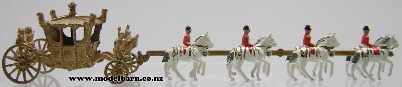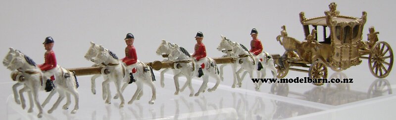Queen Elizabeth II Coronation Carriage & 8 Horses. Made by Crescent Toys in England in the 1950s. Features steerable front axle, metal construction. This is a used item in fair condition for age. One horse is not attached at its rear & it has some paint loss. It's box is in fair condition for its age but has some marks & tears. Only 1 available. This set is 319mm long, 55mm wide & 65mm high.This item is not suitable for children.
