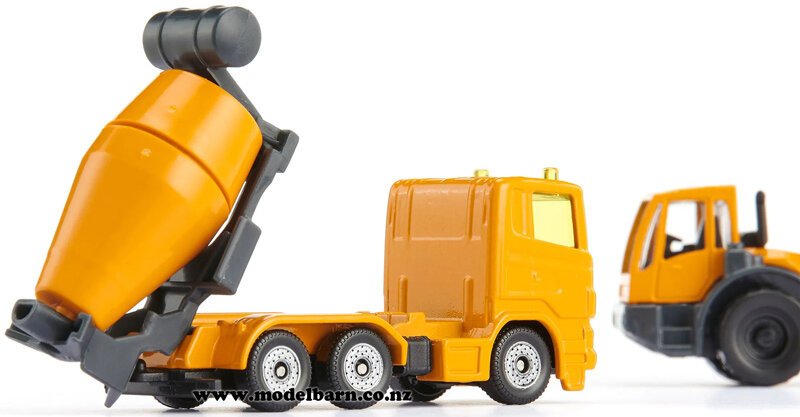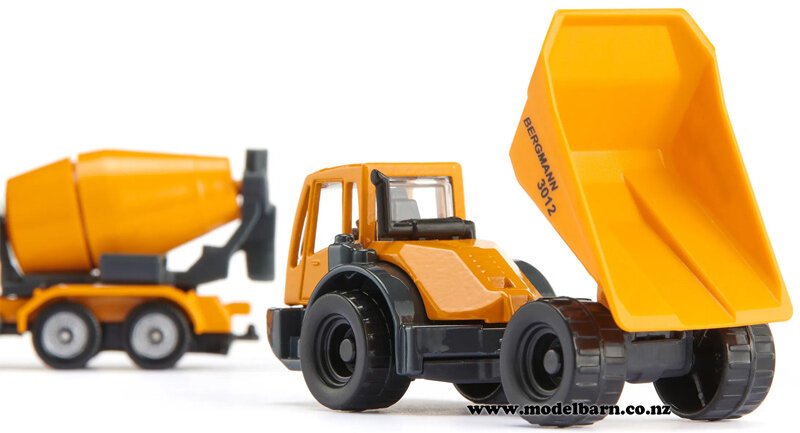 Scania Concrete Mixer Truck & Bergmann 3012 Dumper Set. Made by Siku. Scania features left-hand drive, tipping & rotating bowl & is 84mm long, 28mm wide & 38mm high. Bergmann features rolling wheels, tipping body & is 81mm long, 34mm wide & 55mm high (when fully extended).
