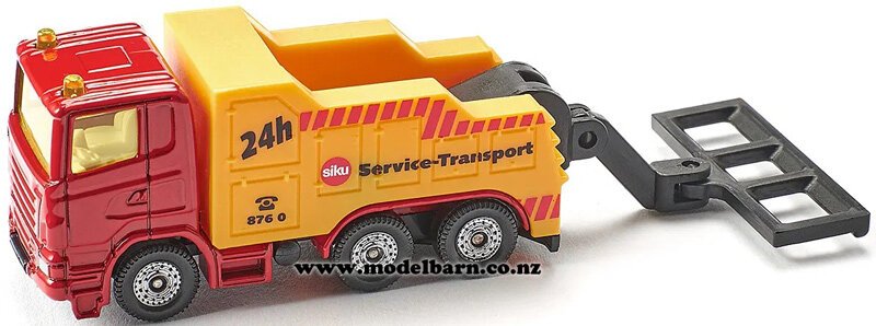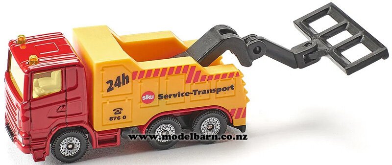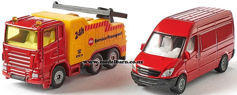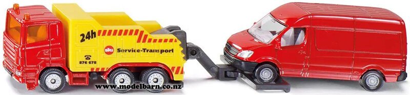 Scania Heavy Tow Truck with Van. Made by Siku. The van can be detached from the tow truck, the tow hook can be raised & lowered. This set is 180mm long, 42mm wide & 35mm high.