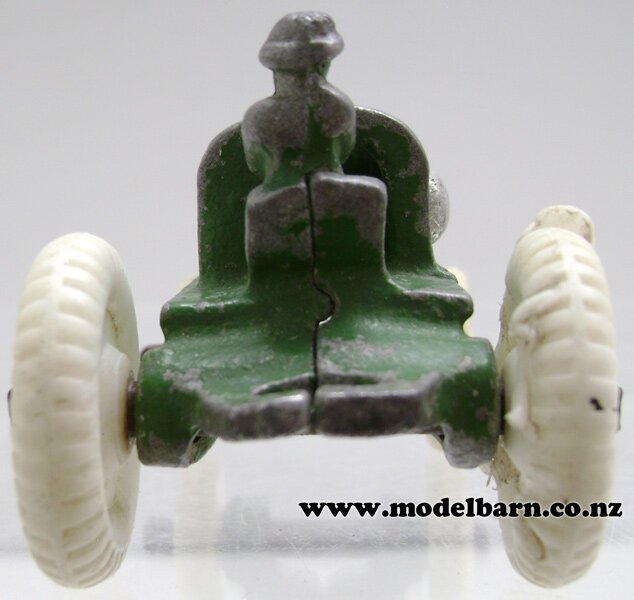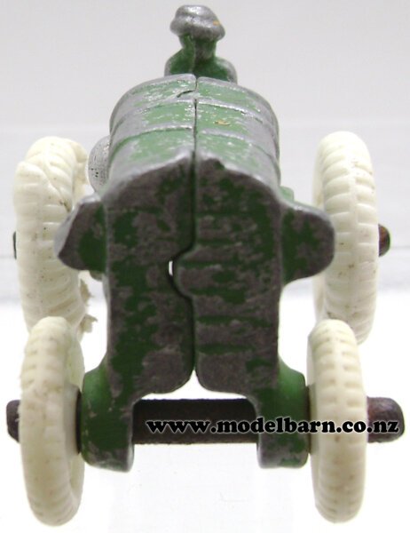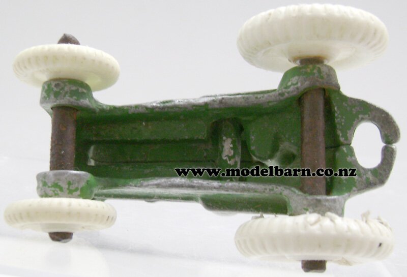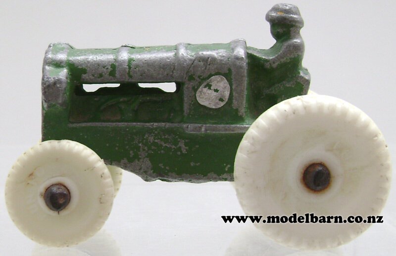 Allis-Chalmers Tractor. Made of aluminium by Fun Ho from 1952 - 1966. Stock number 300. This is a used item in good original playworn condition. Its right front headlight has a piece broken off & there are cuts in the right rear tyre. It has paint loss. Only 1 available. This tractor is 78mm long, 48mm wide & 50mm high.