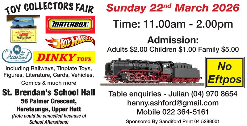 March 22 2026 11.00am - 2.00pmSt Brendan's School Hall56 Palmer CrescentHeretaungaUpper HuttFor further information;Julian Ashford04 970 8654022 364 5161henny.ashford@gmail.comModel Barn will be at this event with full eftpos & credit card facilities. If you need us to bring anything for you, just let us know.
